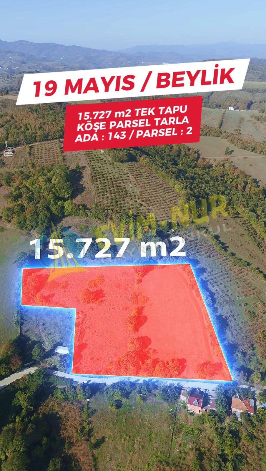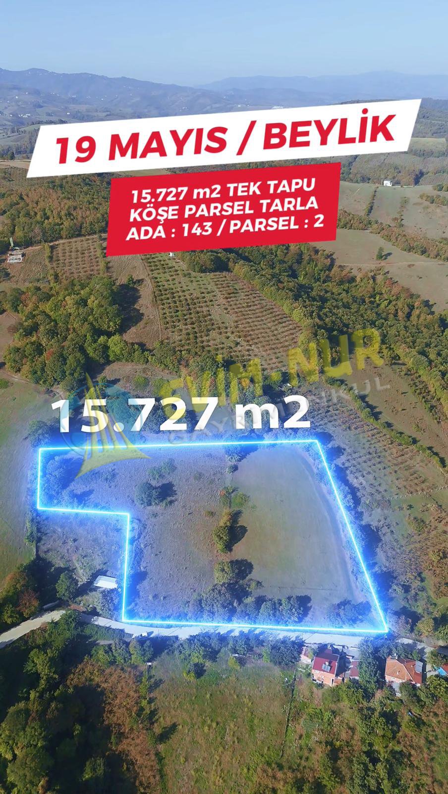 SAMSUN 19 MAYIS BEYLİK MAH 15.727m2 TEK TAPU RESMİ YOLA CEPHE YATIRIMLIK KÖŞE PARSEL TARLA Satılık